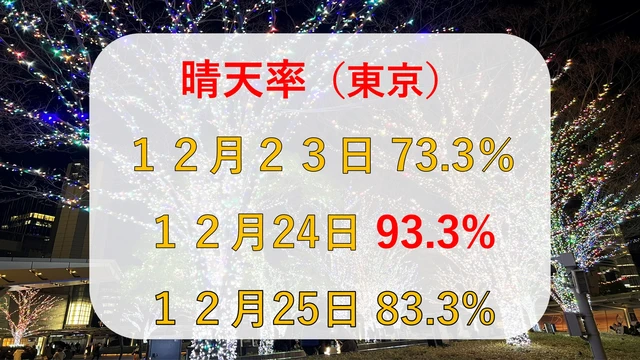 実は、12月24日の東京の天気には、意外な特徴があります。それは、過去30年間(1991年1月1日~2020年12月31日)の統計で、12月24日の晴天率がなんと93.3%と、一年で最も高いのです!12月23日は73.3%、12月25日は83.3%と比べても、その差は歴然。ロマンチックなことに、クリスマスイブは晴れやすい日として知られていました。