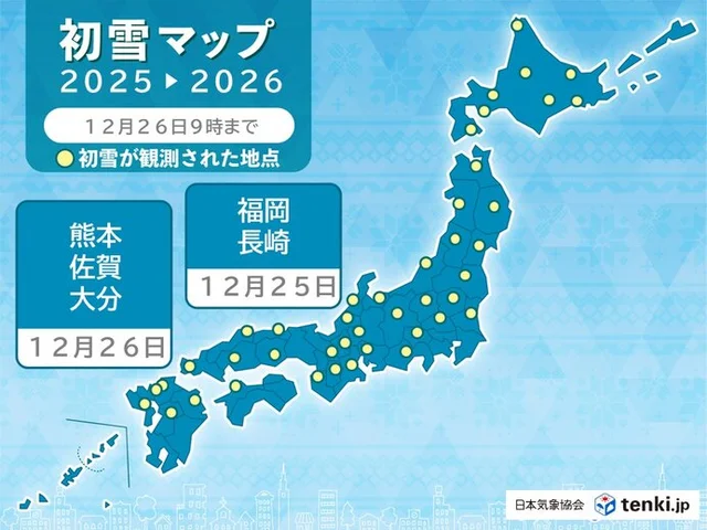 25日夜から26日にかけて、九州各地で初雪が観測されました。福岡、長崎に続き、熊本、佐賀、大分でも白い粉雪が舞い、冬の訪れを告げています。一方、日本海側では記録的な大雪となり、交通機関への影響が懸念されています。