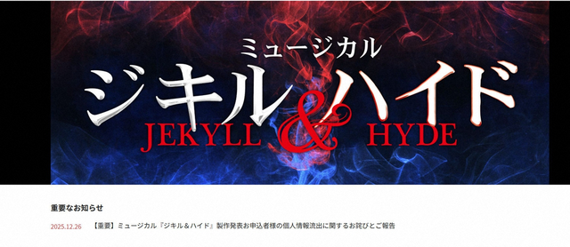 ミュージカル「ジキル&ハイド」制作発表会申込者情報が流出!322名に影響、ホリプロが謝罪と対策を発表