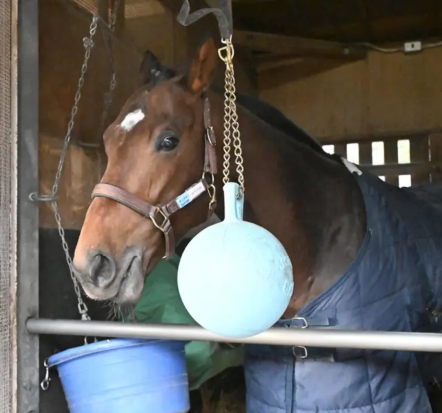 サンライズジパングは、中山競馬場に到着後、馬房でくつろぎの時間を過ごしています。特に目を引くのが、馬房に設置されたお気に入りのボール。平井助手は「前回はソワソワしていたから、遊んでくれれば落ち着く」とコメントしています。