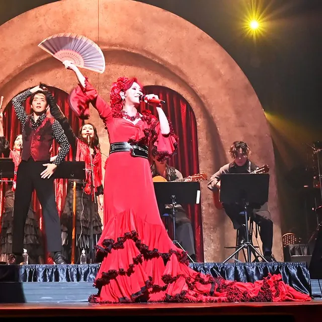 ライブは、パーカッションのフラメンコカホンが響き渡る中、男性ダンサーによるフラメンコの熱いダンスから幕開け。スペインの酒場のような雰囲気が会場を包み込みます。大黒摩季さんは、赤く裾の長いフラメンコドレスを身にまとい、ラテンのリズムに乗せてヒット曲「Miramiramira」と「砂の孤独」を軽やかに歌い上げました。