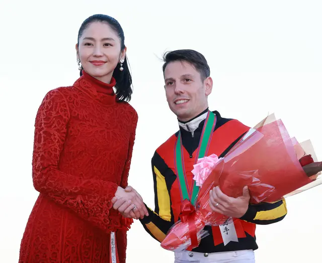 赤いドレスを身にまとい、華々しく登場した長澤さんは、見事優勝したミュージアムマイル号と、C・デムーロ騎手に花束を贈呈。その美しさと上品な立ち振る舞いが、会場をさらに盛り上げました。