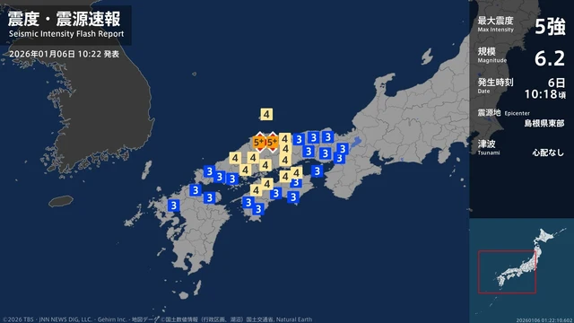 気象庁によりますと、震源地は島根県東部で、震源の深さはおよそ10km。地震の規模を示すマグニチュードは6.2と推定されています。