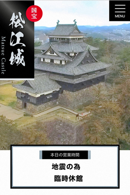 島根県松江市の松江城は、天守閣への登閣を終日中止しています。公式ホームページで「強度の地震のため、臨時休館について」と発表しています。詳細については、