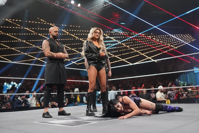 試合終盤、パクスリー選手をサポートするはずだった「ザ・クリング」のメンズ組が、突然パクスリー選手に立ちはだかるという予想外の事態に。さらに、ユニットメンバーのイジー・デイム選手が死角からブートを放り込み、パクスリー選手はダメージを受け、ジェイシー・ジェイン選手にカウント3を奪われてしまいました。