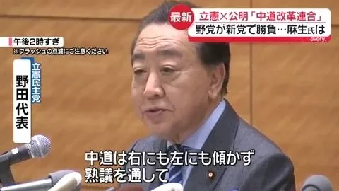 16日に発表された新党の名前は「中道改革連合」。政党カラーは両党のイメージカラーであるブルーの中間色を採用し、まさに“中道”を打ち出しています。立憲民主党の野田佳彦代表は「右にも左にも傾かず、熟議を通して解決策を見いだす」と新党の姿勢を説明しました。