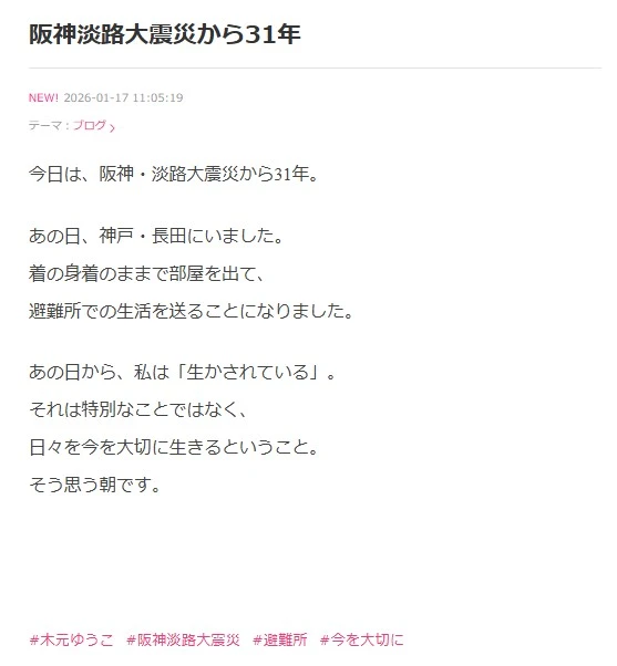 1月17日は、阪神・淡路大震災から31年を迎えた日。女優の木元ゆうこさん(59)が、自身のブログで当時の経験と、そこから得た「今を大切に生きる」という想いを綴りました。