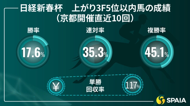 過去10回の京都開催における日経新春杯のデータを分析すると、上がり3F5位以内に入った馬の複勝率はなんと45.1%!これは、連対率35.3%、勝率17.6%と比較しても非常に高い数字です。勝ち馬の9割以上、連対馬の9割近くが、この条件に該当しています。